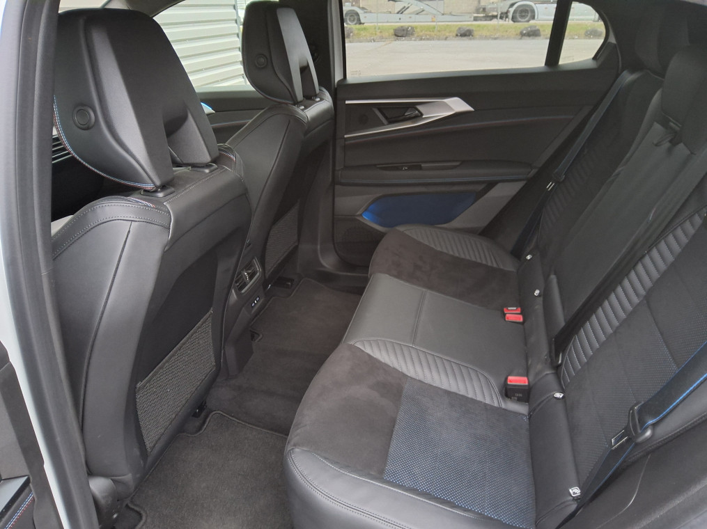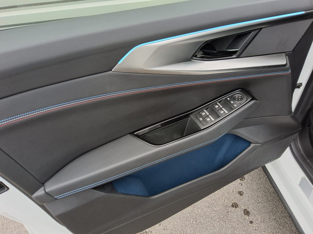 • Sellerie mixte Alcantara avec surpiqures bleues et logo Alpine lumineux